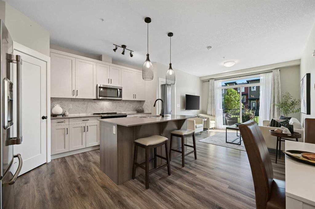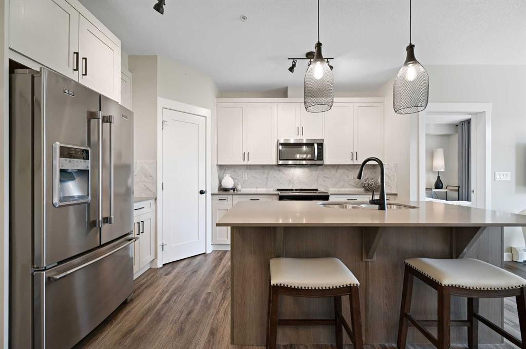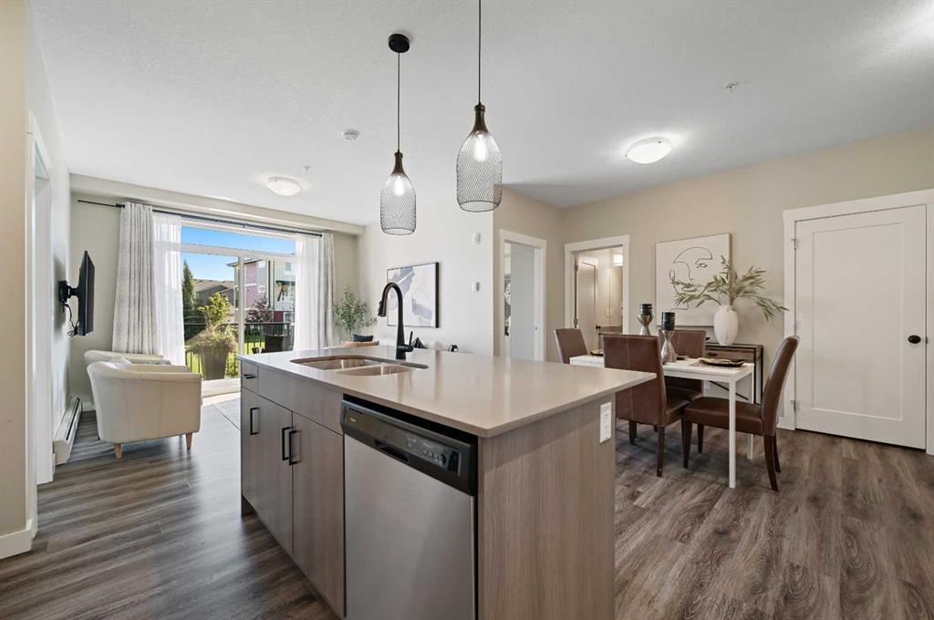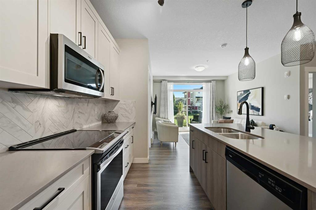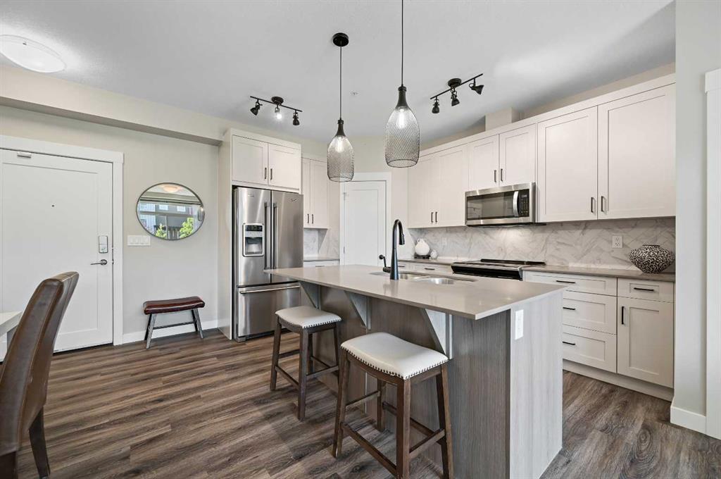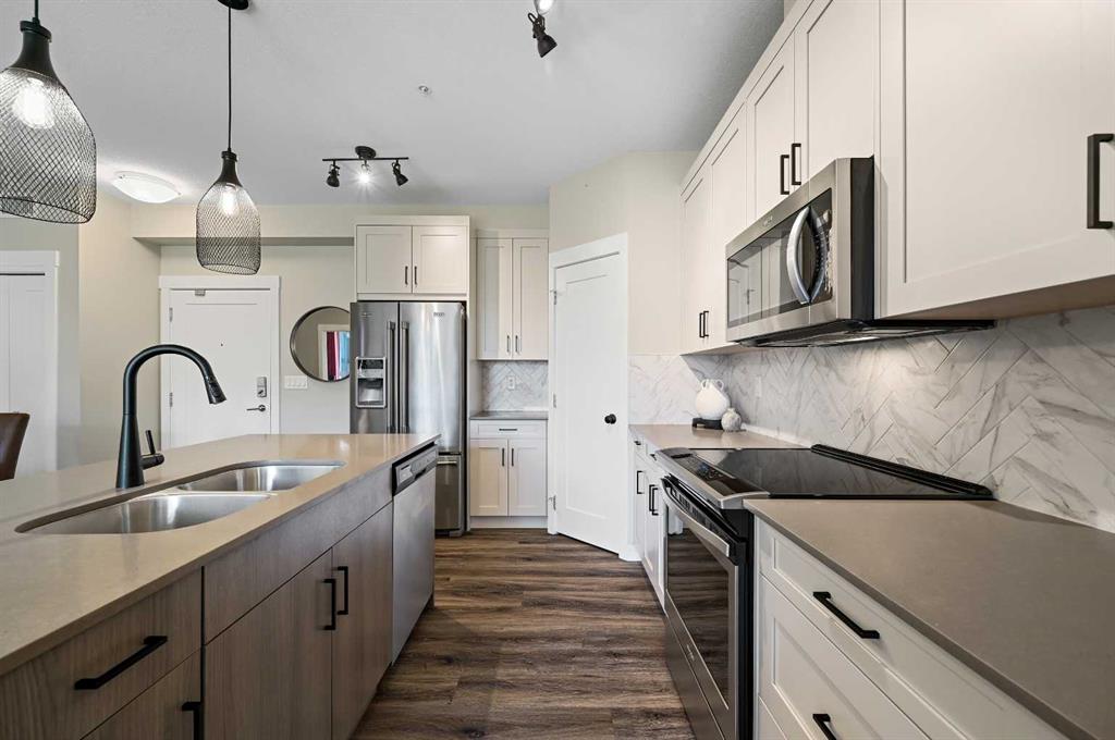 IN ABSOLUTELY MINT CONDITION! 823 sq ft 2 bedroom | 2 bath apartment condo by Cardel Lifestyles, overlooking a quiet tastefully landscaped COURTYARD with a raised elevation for just a little more privacy! MUST-HAVES include easy-care luxury vinyl plank flooring throughout the entire condo. You'll love the 9 ft ceilings, super-open concept and cozy infloor heat. Bright kitchen with large island complete with quartz counter-tops, upgraded stainless steel appliances, pendant lighting and a spacious corner pantry. Decorated in designer neutrals, your new place will compliment any furniture style. Supersized sliding patio door opens to a 16 foot balcony, complete with bbq gas line and a personal gate that opens out into the court-yard. Got a dog? Want a dog? This is the place for you! Easy access from your own balcony opens to dog-friendly pathways and special dog areas in this complex allow you to enjoy after-work walks with your best friend. Generous master bedroom easily fits a king sized bed and more. Walk-in closet and a 4 piece ensuite with his and her sinks along with an oversized glass shower. All bathrooms come with quartz countertops. A second full bathroom services the 2nd bedroom. Large windows in this unit flood allow for lots of light. In-suite laundry comes with a stacking washer and dryer and storage. Extra storage available in the storage locker at the head of your titled underground heated parking spot. Very secure buildling and well-managed condo board. Abundant visitor parking in this friendly modern community. Condo fees only $382/mo, and include heat, water, sewer, and more. Pick your possession date!