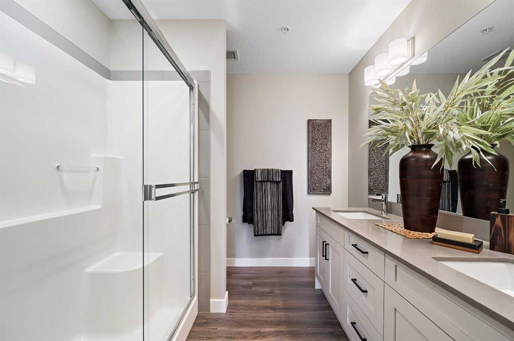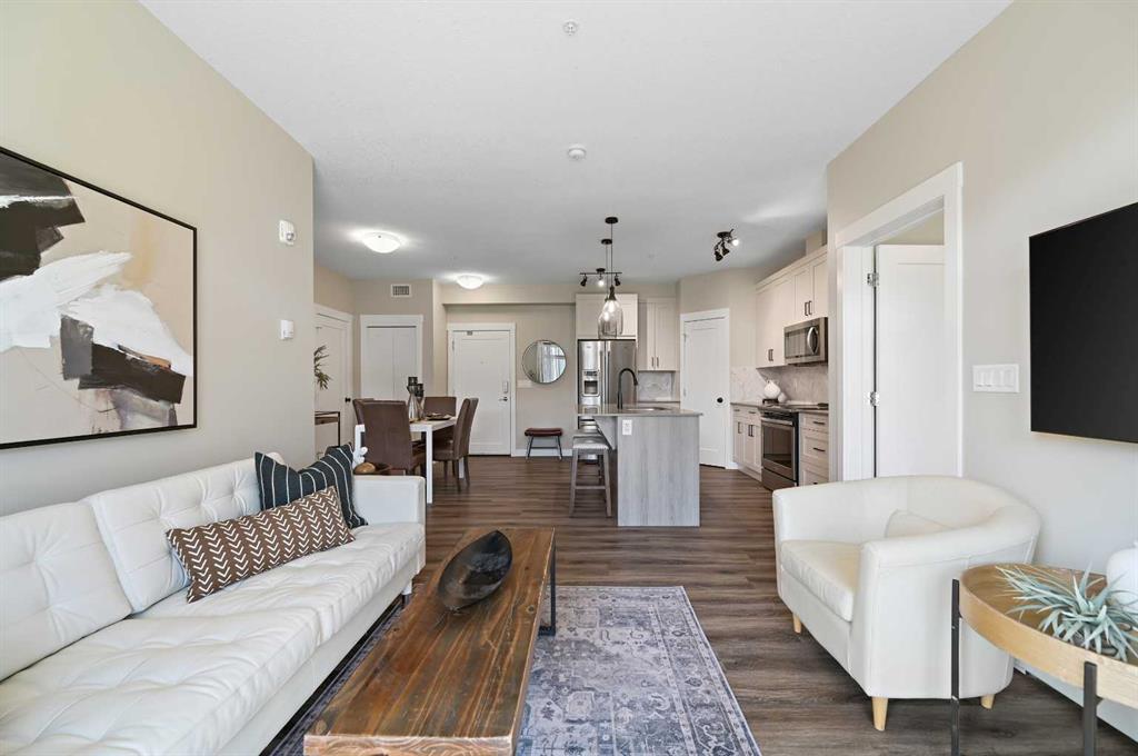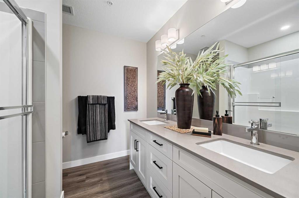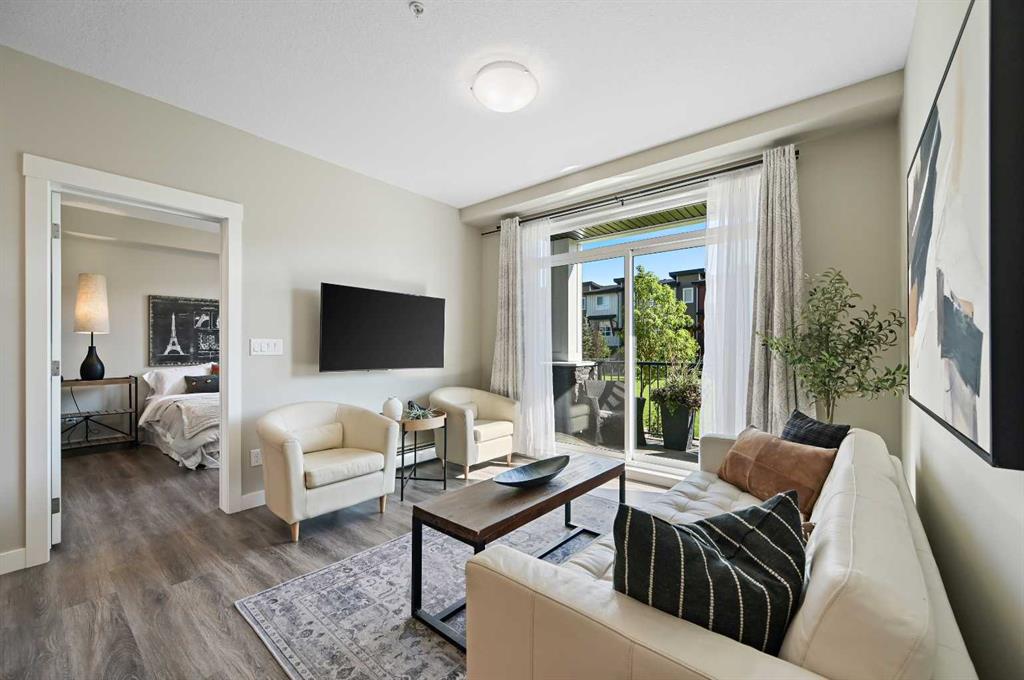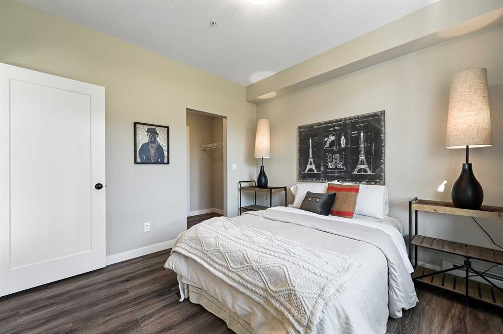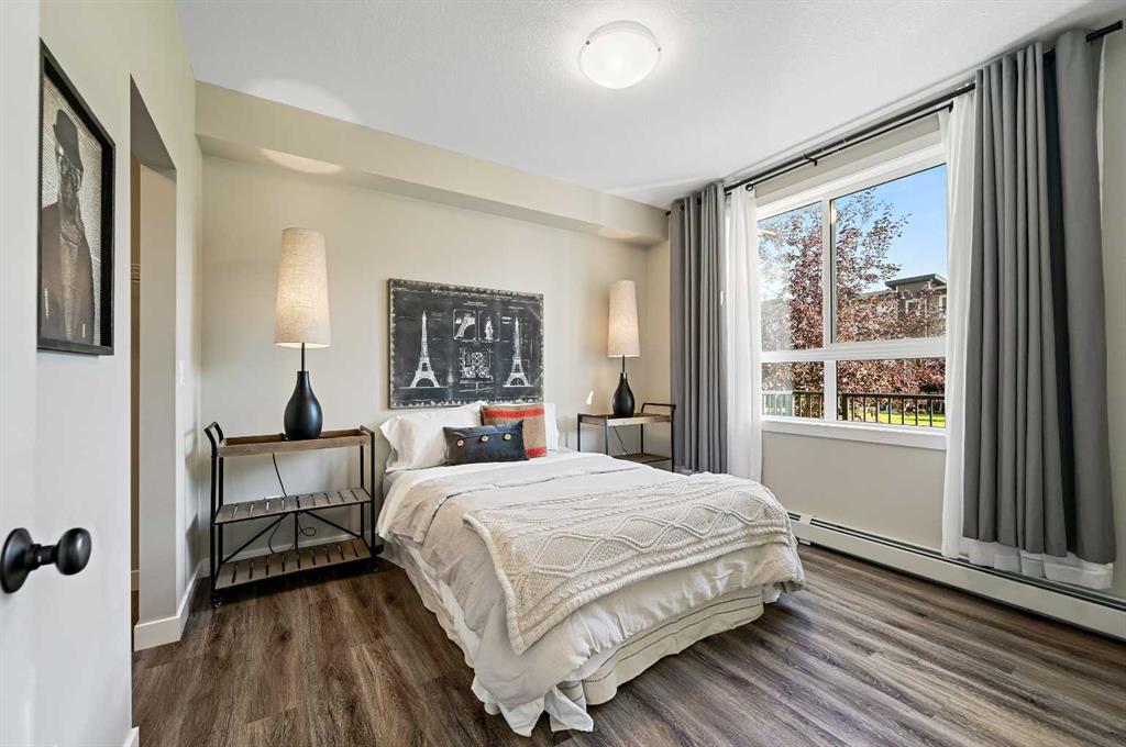 IN ABSOLUTELY MINT CONDITION! 823 sq ft 2 bedroom | 2 bath apartment condo by Cardel Lifestyles, overlooking a quiet tastefully landscaped COURTYARD with a raised elevation for just a little more privacy! MUST-HAVES include easy-care luxury vinyl plank flooring throughout the entire condo. You'll love the 9 ft ceilings, super-open concept and cozy infloor heat. Bright kitchen with large island complete with quartz counter-tops, upgraded stainless steel appliances, pendant lighting and a spacious corner pantry. Decorated in designer neutrals, your new place will compliment any furniture style. Supersized sliding patio door opens to a 16 foot balcony, complete with bbq gas line and a personal gate that opens out into the court-yard. Got a dog? Want a dog? This is the place for you! Easy access from your own balcony opens to dog-friendly pathways and special dog areas in this complex allow you to enjoy after-work walks with your best friend. Generous master bedroom easily fits a king sized bed and more. Walk-in closet and a 4 piece ensuite with his and her sinks along with an oversized glass shower. All bathrooms come with quartz countertops. A second full bathroom services the 2nd bedroom. Large windows in this unit flood allow for lots of light. In-suite laundry comes with a stacking washer and dryer and storage. Extra storage available in the storage locker at the head of your titled underground heated parking spot. Very secure buildling and well-managed condo board. Abundant visitor parking in this friendly modern community. Condo fees only $382/mo, and include heat, water, sewer, and more. Pick your possession date!